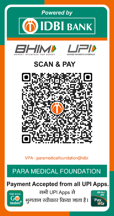 | PARA MEDICAL FOUNDATION IDBI Bank A/c No: 0286104000140362 Account: Saving A/c IFSC Code: IBKL0000286 Branch: Pushpkunj Maninagar, Ahmedabad, GUJARAT |